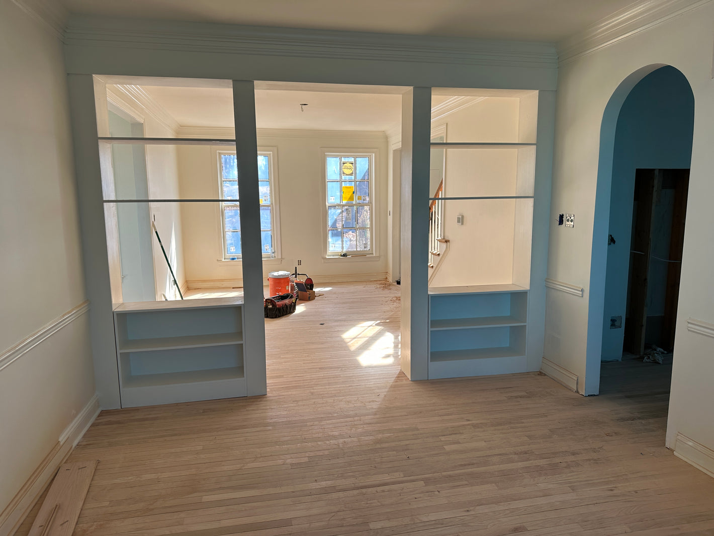 2 Custom Bookshelves with shelves above to separate a dining room and library. Perfectly fitted in between two existing columns.
