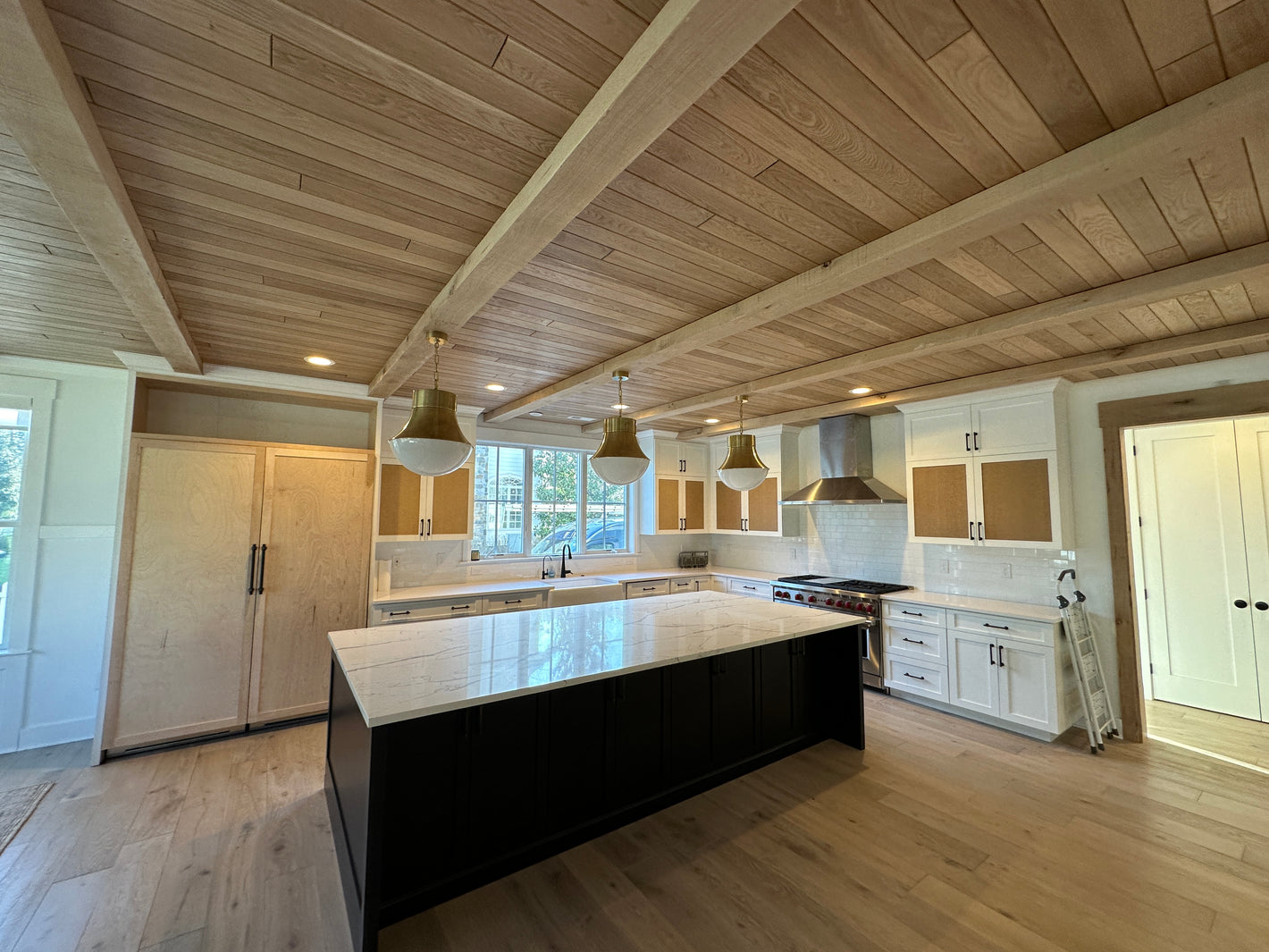 We milled and installed this white oak ceiling to give this modern house a warmer feel. The added rustic beams give it a floor and joist look. Finished with a clear coat to keep the color lasting.