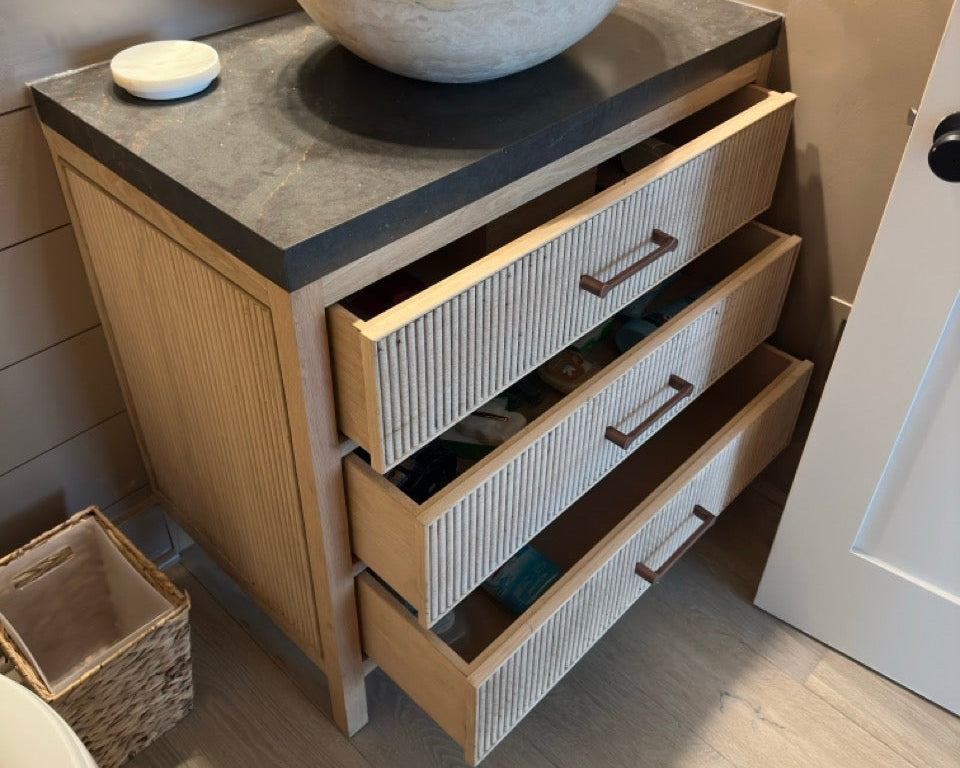 This white oak vanity was made has a soapstone top with a stone sink. We built the drawers with a notch to go around plumbing while still providing storage space!