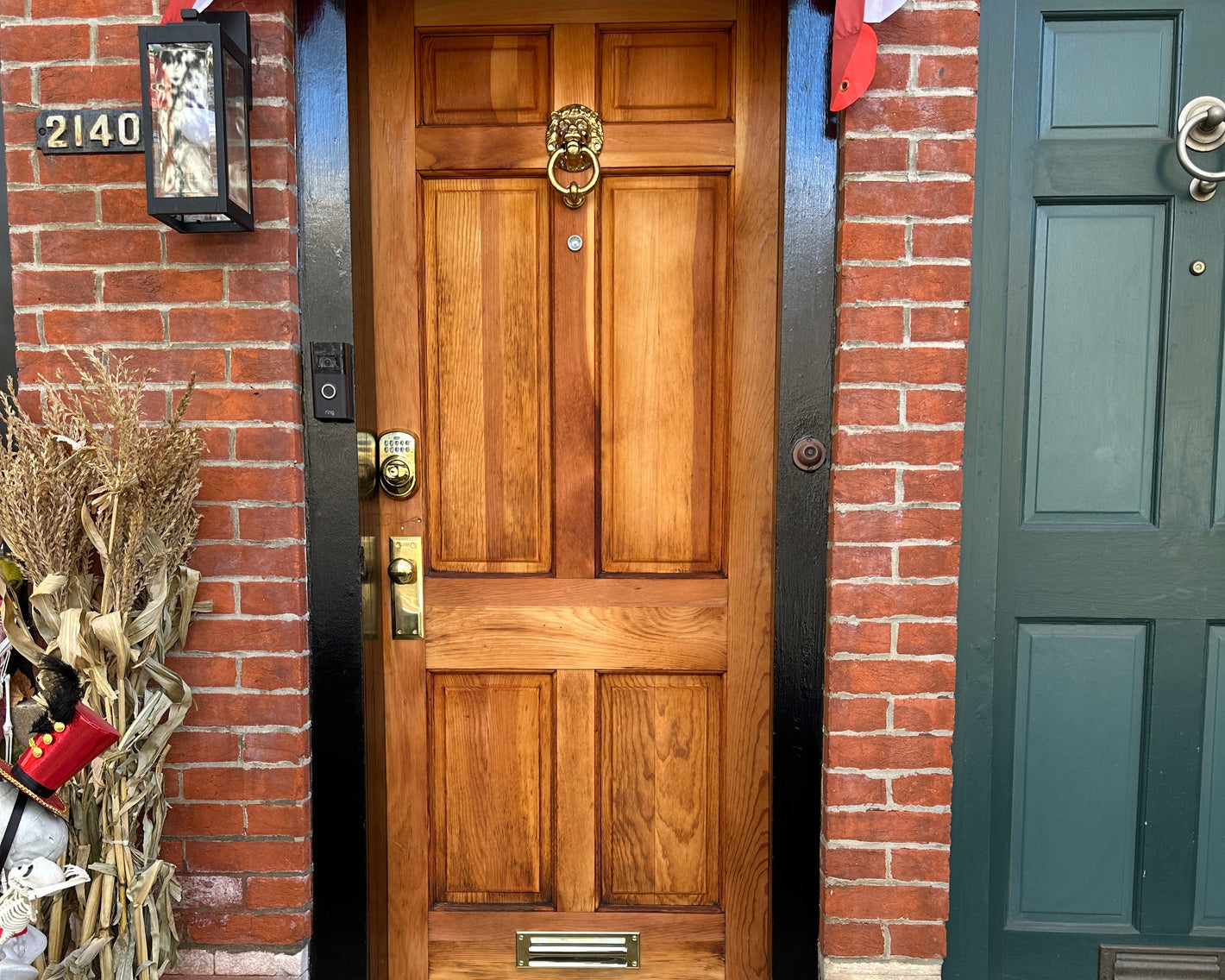 We refinished this door from 1890 made from eastern white pine. We stripped the old finish and applied a new oil rubbed finish. All the old hardware came off and we replaced it with all solid brass hardware.