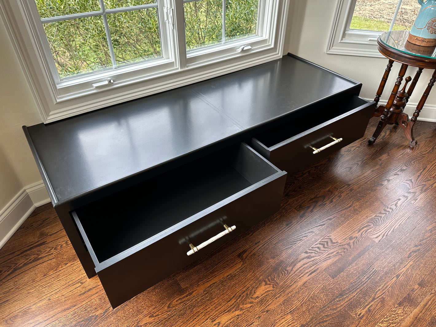 We built this custom bench to fit under the window so our customer can enjoy a good book and natural light. (A cushion was made to sit on top after we installed) Two drawers provide extra storage!